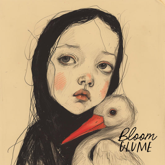 Eloise and her Stork print set, creepy cute, dark cottagecore, illustration art, fantasy artwork, storybook art, line art, low brow art